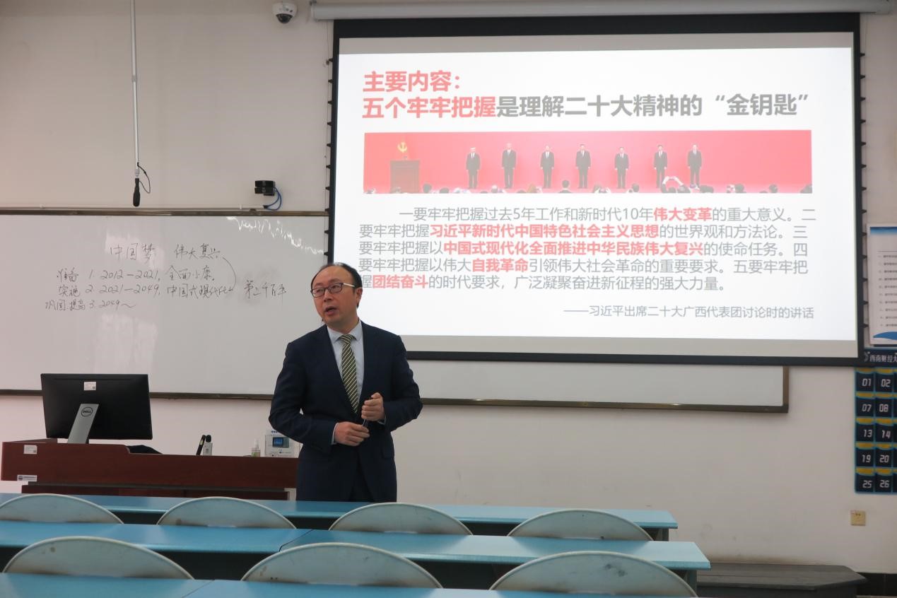 院长杨海洋在柳林校区颐德楼H408以“深入学习贯彻二十大精神,以中国式现代化推进中华民族伟大复兴”为主题,为同学们讲授的思想政治理论(专题)课。