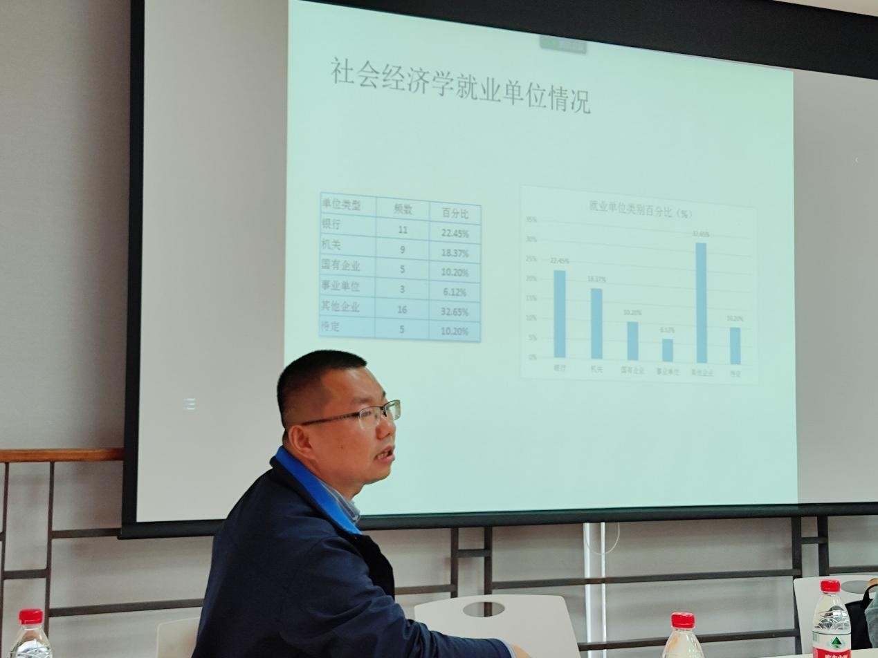 谭远发所长展示了社会经济学专业这十多年来招生的具体情况。谭所长首先指出,2013年是社会经济学专业转换期,在性别比例方面,招收学生从男生偏多到现在女生居多;紧接着,谭所长展示的往届社会经济学就业相关数据表示,银行就业人数最多,其次是机关单位以及国有企业;最后,谭所长为师生介绍了社会经济学专业的师资情况以及硕士研究生研究方向。