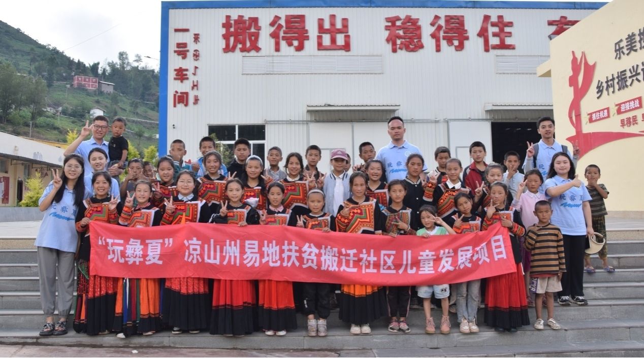 卢虹羽、姚丹、陈诗曼、陈前怡飞、李佳璐、陈园京、陈运忠、杨兴月、马晶等同学主力参加。该项目以凉山彝族自治州大型易地扶贫搬迁安置社区内,既有流动儿童的流动性,又有留守儿童的留守性,还有困境儿童的困境性,面临多重困境的儿童为服务对象。采取大学生志愿者+本土彝族志愿者的服务模式,摈弃传统负向与问题思维,全面贯彻“优势视角+文化敏感+增权赋能”的服务理念,有效落实“以儿童为纽带、以家庭为基础、以社区为中心”的服务策略,采取彝族儿童喜欢又擅长的形式,联动各方实施“8个1”工程,以玩为媒联动家庭与社区,实现从儿童到家庭再到社区的立体服务效果,深受好评。
