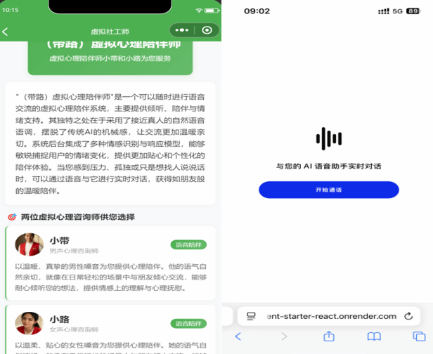 微信小程序还嵌入了何龙韬教授与甄买(上海)信息科技有限公司技术专家跨界联合研发的“带路AI心理陪伴师”(语音互动大模型)。该虚拟社会工作师并非通用型聊天机器人,而是面向社会工作中高度情感化、伦理敏感的服务需求进行专门设计,降低聊天互动中的人机感,构建了男心理陪伴师“小带”和女心理陪伴师“小路”两种形象。通过精细化的 prompt设计与深度学习模型训练,系统可在语音对话中承担情绪支持、心理辅导、情感交流等辅助性服务。在使用机制上,平台为每位用户每日提供约15分钟的免费语音交互时长,在保障基本服务可及性的同时,引导用户回归现实支持网络与专业服务体系,以确保平台资源的可持续使用并避免对单一技术载体的过度依赖。